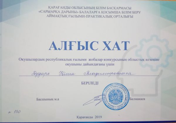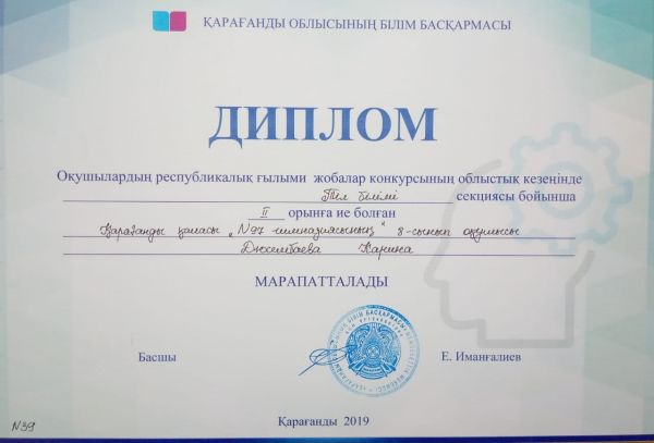 Поздравляем призеров Областного этапа Республиканского конкурса научных проектов Дюсембаеву Карину (2 место, секция "Языкознание", руководитель Бейсенгалиева С.Т.) и Махмудову Раяну (3 мес…