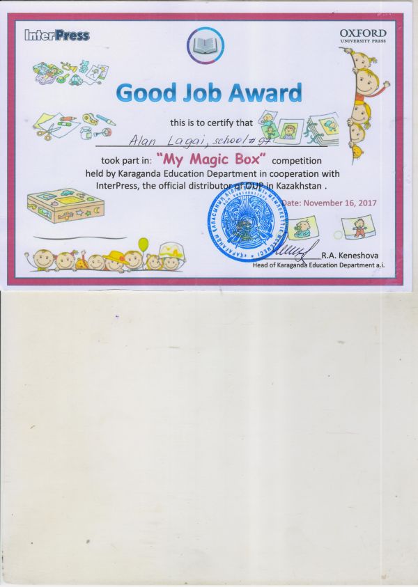 16 ноября 2017 г. состоялся конкурс проектов "My magic box" на базе КГУ Гимназии № 38. Ученик 3 Г класса Лагай Алан занял 2 место, руководитель Мешалкина Олеся Николаевна.