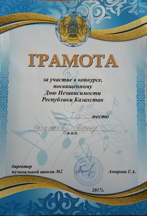 Поздравляем  ученика 6 «А» класса Нагатаева  Даяна за занятое 1 место в конкурсе, посвященном Дню Независимости Республики Казахстан, проведенном в областной музыкальной школе…