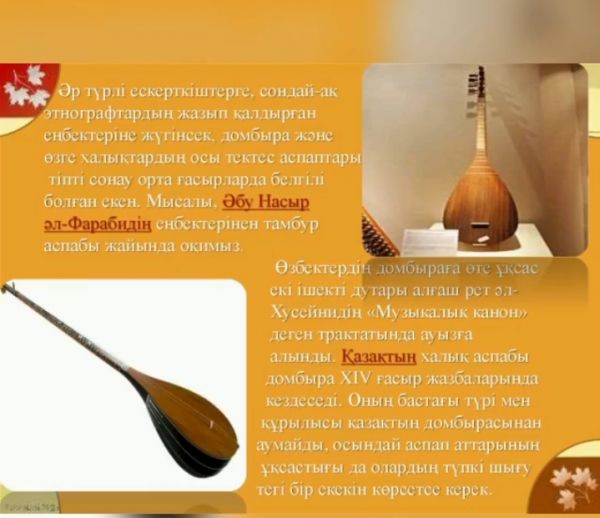 Домбыра​ —​ қазақ халқының​ ең кең тараған екі ішекті, көп пернелі музыкалық аспабы. Ол – қазақтар өмірінде маңызды орын алатын, өзіндік музыкалық сипаты бар аспап. Алғаш…