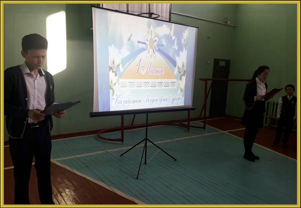 2019 жылдың 29 сәуірі күні 1-11 сынып оқушылары үшін 9А сынып оқушылары мектеп тәлімгері Б.А Сәрсембиеваның жетекшілігімен «1 – мамыр Қазақстан халықтарының бірлігі күні» тақырыбында саптық жиын өткізді және бейнеролик көрсетілімін ұйымдастырды. Мақсаты: