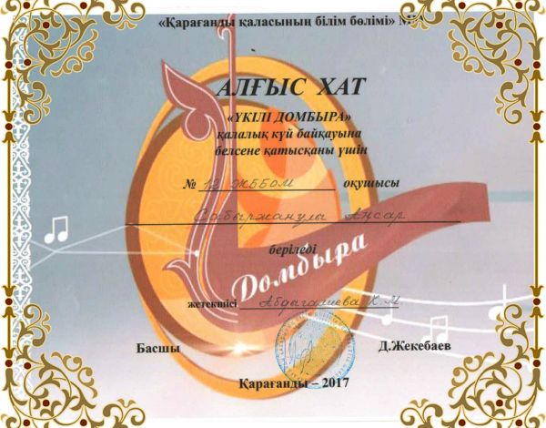 «Қарағанды қаласының білім бөлімі» ММ және «№36 жалпы білім беретін орта мектеп» КММ ұйымдастыруымен өткізген «Үкілі домбыра» атты қалалық күй байқауына қатысып,…
