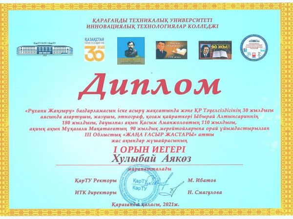 III Облыстық "ЖАҢА ҒАСЫР ЖАСТАРЫ" атты жас ақындар мүшәйрасының I Орын иегері мектебіміздің 11-сынып оқушысы- Хулыбай Аякөз марапатталды.