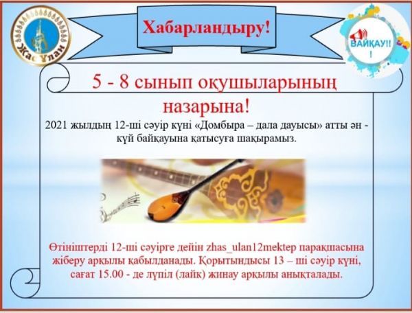 Хабарландыру! 5 - 8 сынып оқушыларының назарына! 2021 жылдың 12-ші сәуір күні «Домбыра – дала дауысы» атты ән - күй байқауына қатысуға шақырамыз. Мақсаты: оқушылардың ой ұшқырлығын…