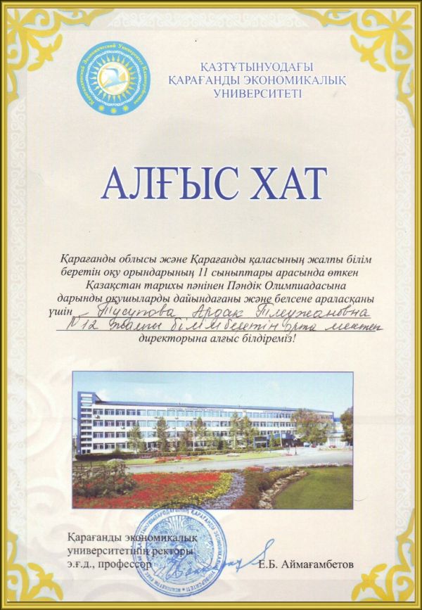 ҚАЗТҰТЫНУОДАҒЫ ҚАРАҒАНДЫ ЭКОНОМИКАЛЫҚ УНИВЕРСИТЕТІ 09.12.17 өткізген Қарағанды қаласы жалпы білім беретін оқу орындарының 11 сыныптары арасында өткен Қазақстан тарихы пәнінен пәндік Олимпиадасында&n…