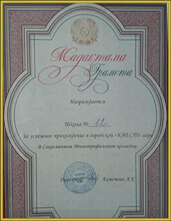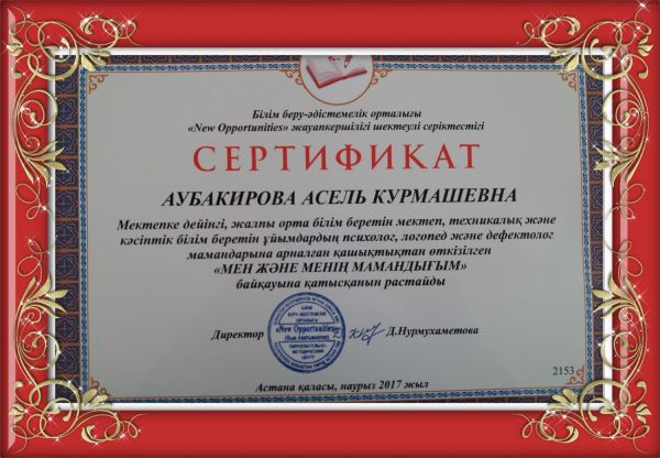 №12ЖББОМ психологі " Мен және менің мамандығым" тақырыбы бойынша сертификат пен марапатталды.
