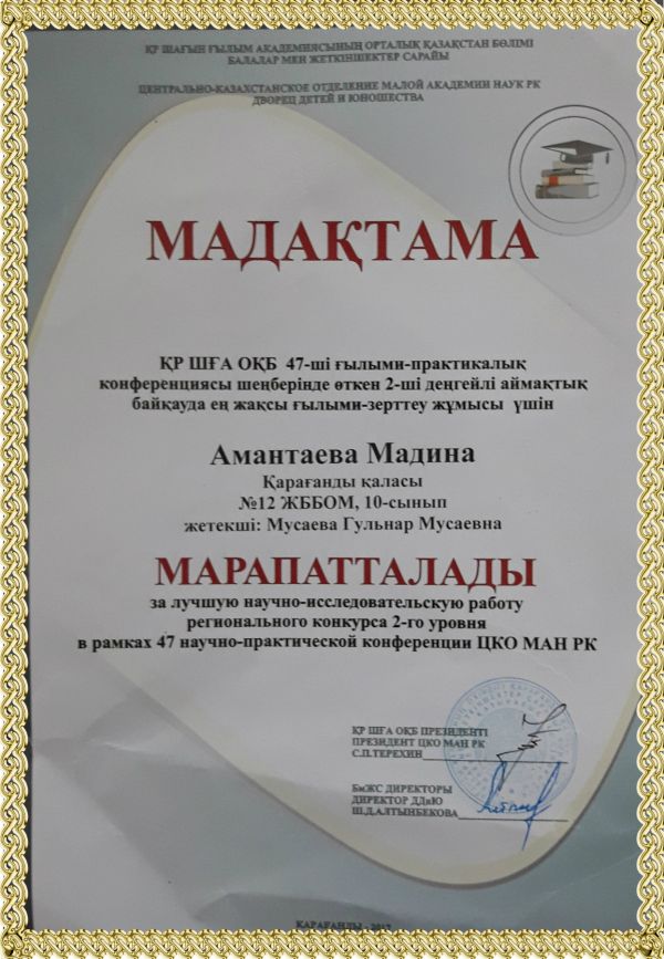 ҚР ШҒА ОҚБ 47-ші ғылыми-практикалық конференциясы шеңберінде өткен 2-ші деңгейлі аймақтық ғылыми-зерттеу жұмыстарының байқауында жеңіске жеткені үшін Қасым Аружан және Амантаева Мадина мадақтамамен…
