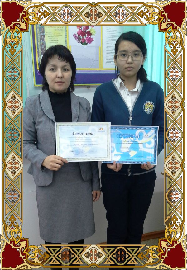 «Сарыарқа дарыны» аймақтық ғылыми-практикалық орталығы «Менің Тәуелсіз Қазақстаным»атты облыстық сурет байқауына қатысқаны үшін Имамбаева  Аяжанды  сертификатпен, а…