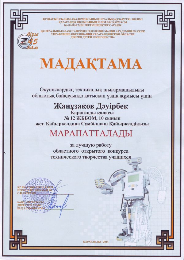 Балалар мен жеткіншектер сарайында өткен Оқушылардың техникалық шығармашылығы облыстық байқауында қатысқан үздік жұмыстары үшін 10 В сынып оқушылары Талкенова Фатима, Жанұзақов Дәуірбек…