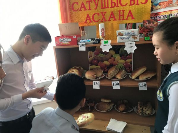 Сатушысыз асхана. Оқушыларымыз өзіне қажетті заттарды алып, алынған тауардың ақшасын арнайы қорапшаға қалдырады. Дүкенде ешкім сатып алушыларды бақыламайды.Барлығы сенім мен адалдыққа бағытталған. Ө…