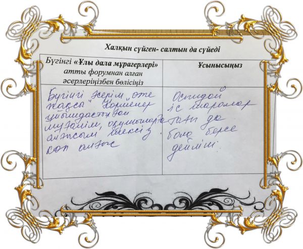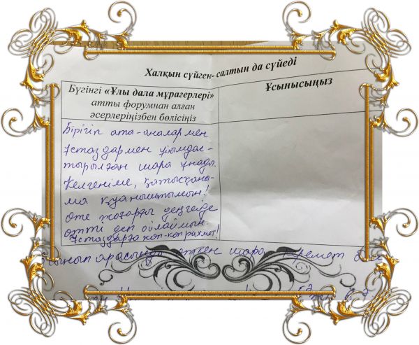 16 қараша күні мектебімізде өткен "Ұлы дала мұрагерлері" атты форум ата-аналарымыздың көңілінен шықты. Олардың мектеп ұжымына айтқан алғыстары шексіз. Осы форумнан алған ата-аналардың әсер…