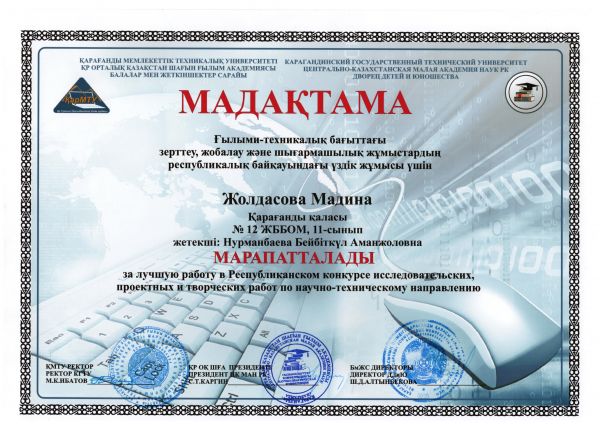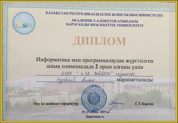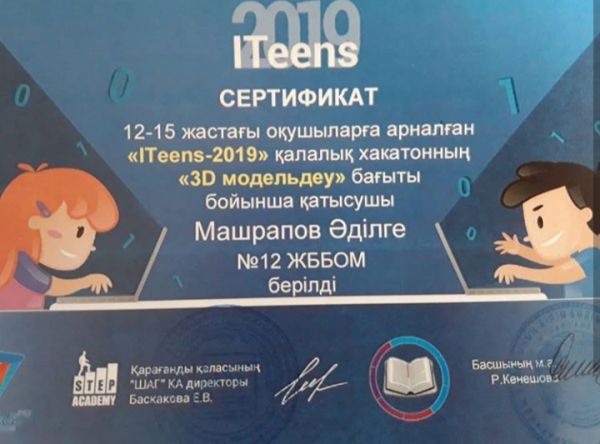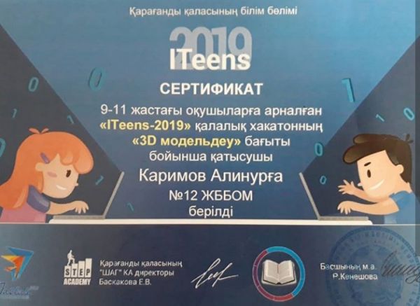 "ITeens-2019" қалалық хакатонда "3D модельдеу" бағыты бойынша, мектебіміздің 5 Ә сынып оқушысы Байтокин Әділжан ІІ орын иеленіп, дипломмен марапатталды. Сонымен қатар Каримов Али…