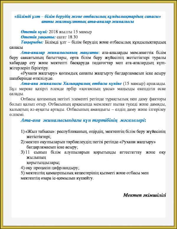 «Білімді ұлт – білім берудің және отбасылық құндылықтардың сапасы» атты жалпыұлттық ата-аналар жиналысы.