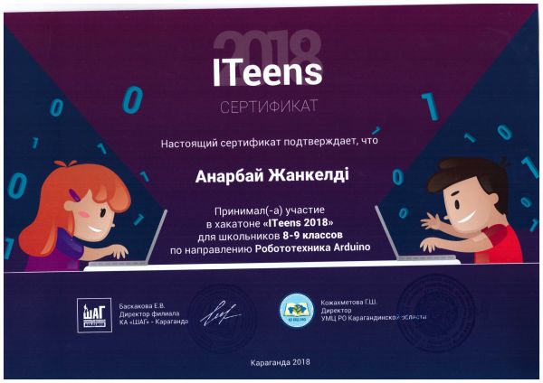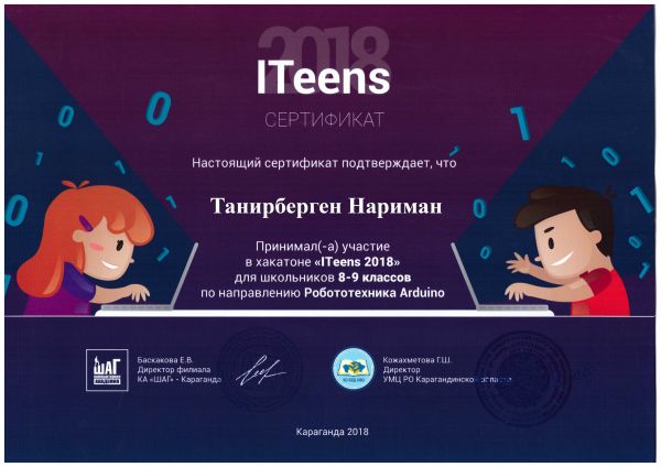 17-18 сәір күні 8-9 сыныптар арасында робототехника Arduino бағытында өткен ITeens 2018 хакатон олимпиадасына қатысқаны үшін 9 сынып оқушылары Анарбай Жанкелді мен Танирберген Нариман сертификатпен…