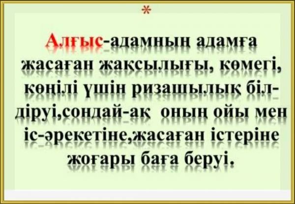 Алғыс-адамның адамға жасаған жақсылығы, көмегі, көңілі үшін ризашылық білдіруі, сондай-ақ оның ойы мен іс&ndash…