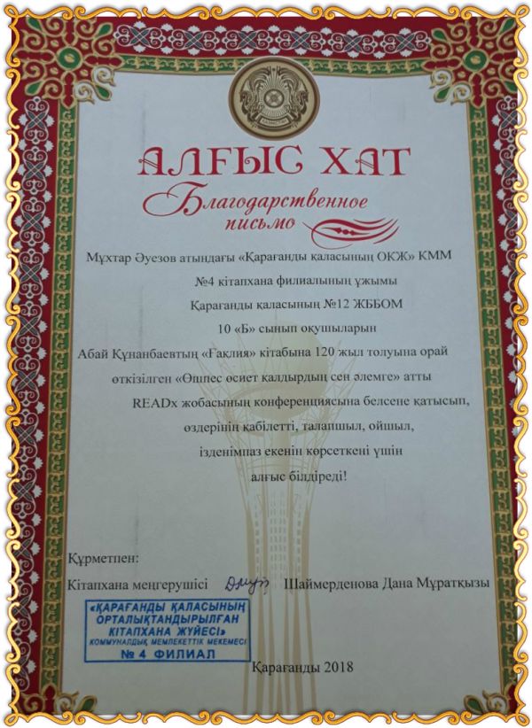 08.02 күні М. Әуезов атындағы «Қарағанды қаласының ОҚЖ» КММ №4 кітапхана филиалында А.Құнанбаевтың «Ғаклия» кітабына 120 жыл толуына орай «Өшпес өсиет қалды…