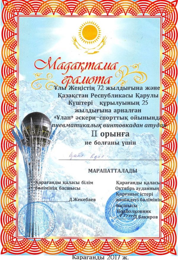 Дзюдодан жасөспірімдер мен қыздар арасында өткен Қарағанды облысының Біріншілігінде 63 келі салмақ дәрежесінде ІІ орын алғаны үшін Манарбек Кәусар марапатталады.