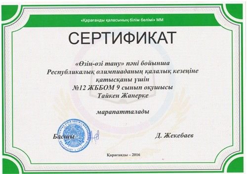 " Өзін-өзі тану" пәні бойынша Республикалық олимпиаданың қалалық кезеңіне қатысқан үшін 7 сынып оқушысы Сламгалиева Ләззат ,9 сынып оқушысы Тайкенова Жанерке марапатталады