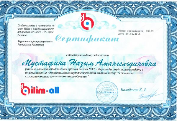 Поздравляем  Мустафину  Назым  Амангельдиновну,  учителя  русского  языка  и  литературы  общеообразовательной  средней школы №12  г.Караганды,…