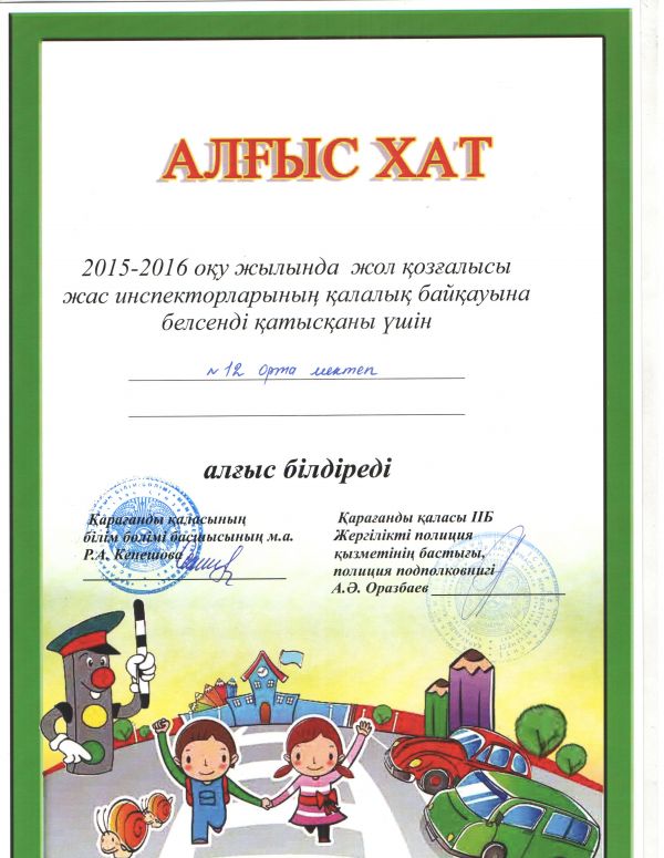 Жас жол қозғалыс инспекторларының қалалық байқауына №12 орта мектеп оқушылары қатысып, «Алғыс хатпен» марапатталды…
