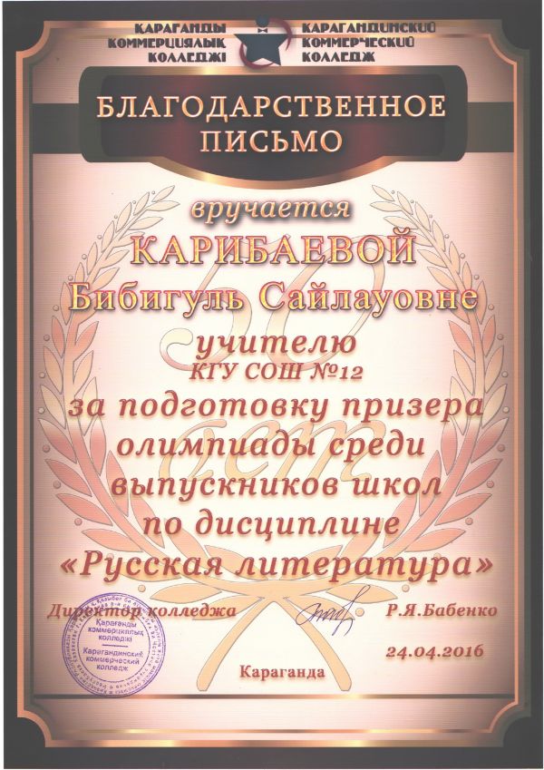 В олимпиаде по русской литературе , организованном Карагандинским Коммерческим колледжем приняли участие учащиеся 9 В класса Нурмуратова Маржан и Имамбаева Аяжан. Целями олимпиады были: формирование…