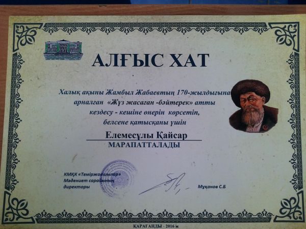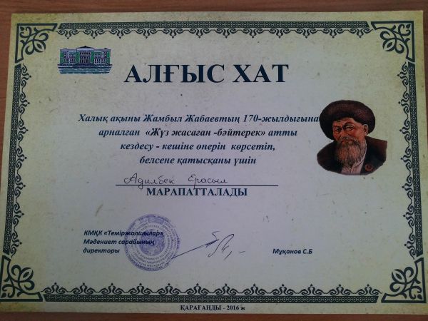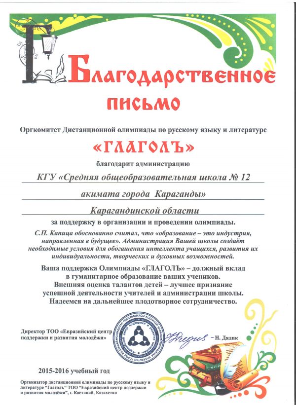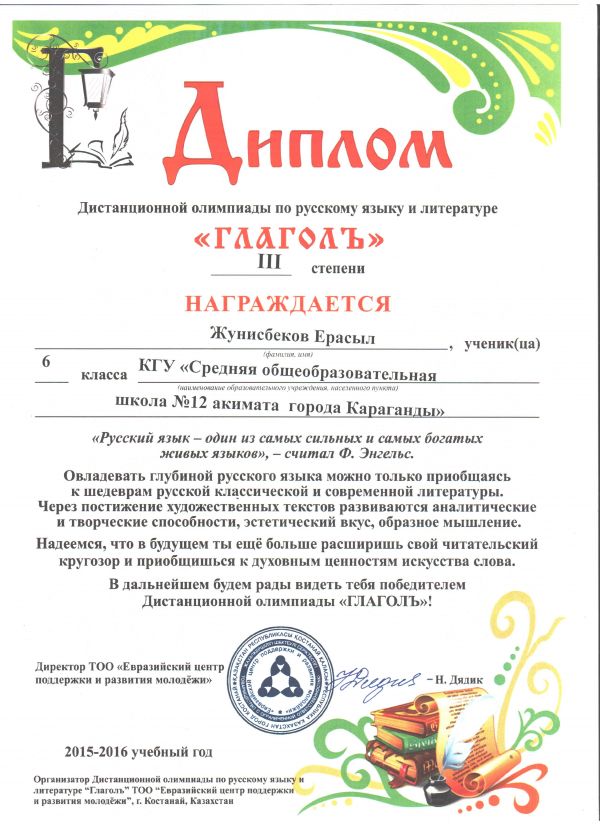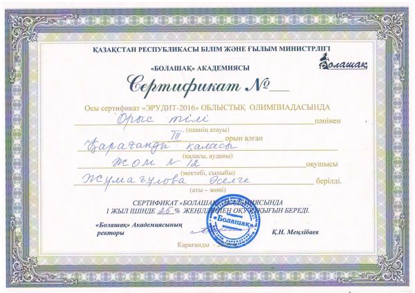 Қарағанды қаласында өткен «Эрудит-2016» облыстық олимпиадасында орыс тілі пәнінен III орын алған Жұмағұлова Әселді сертификатымен құттықтаймыз!
