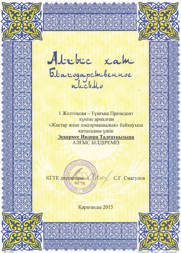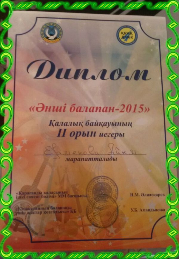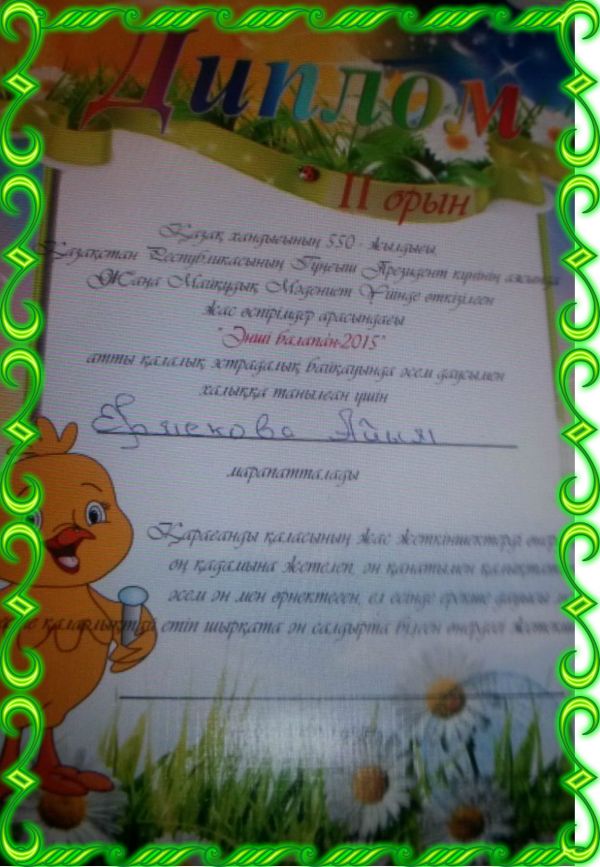 «Сарыарқа дарыны» аймақтық ғылыми-практикалық орталығы «Менің Тәуелсіз Қазақстаным» атты облыстық сурет байқауына қатысқаны үшін Зекенова Асылайды сертификатпен, ал сынып жет…