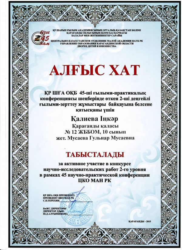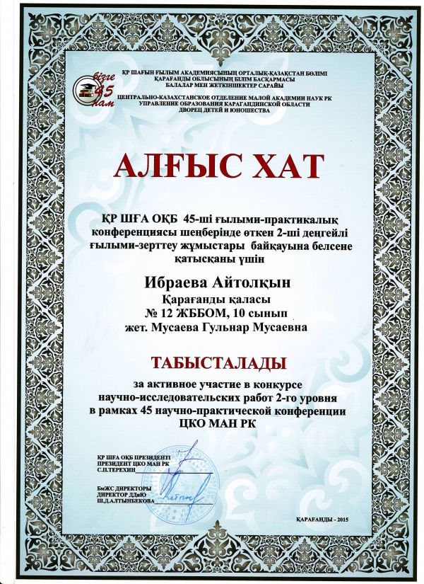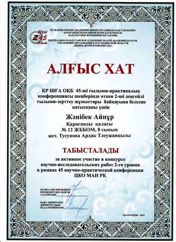 ҚР ШҒА ОҚБ 45-ші ғылыми-практикалық конференциясы шеңберінде өткен 2-ші деңгейлі ғылыми-зерттеу жұмыстары байқауына белсене қатысқаны үшін 8 сынып оқушылары: Туганбекова Анара,Макаева Азиза,Балтабай…
