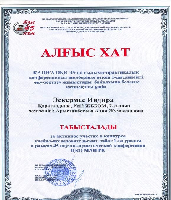 ҚР ШҒА ОҚБ 45-щі ғылыми практикалық конференциясы шеңберінде өткен 1-ші деңгейлі оқу-зерттеу жұмыстарына 7 «В»-сынып оқушысы Эскермес Индира белсене қатысып,алғыс хатпен мара…
