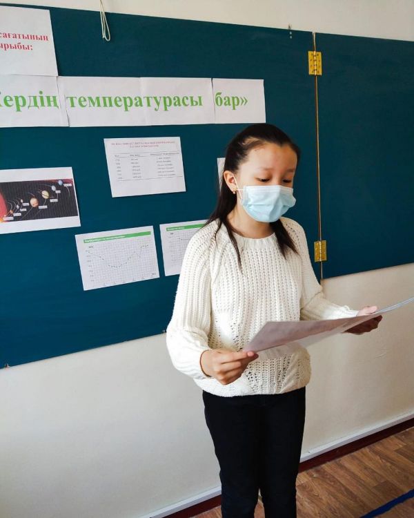 5Ә сыныбында "Жасыл Қазақстан" экологиялық сауаттылық апталығы аясында "Жердің температурасы" тақырыбында сынып сағаты өтті. Мақсаты: Оқушыларды әлемдегі көмірқышқыл газ шы…