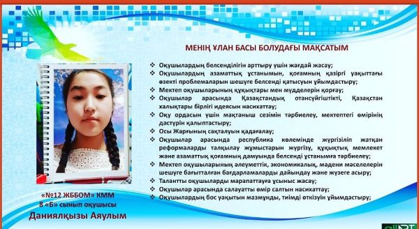 ҰЛАН БАСЫ сайлауының үміткері 8"Б" сынып оқушысы Даниялқызы Аяулым