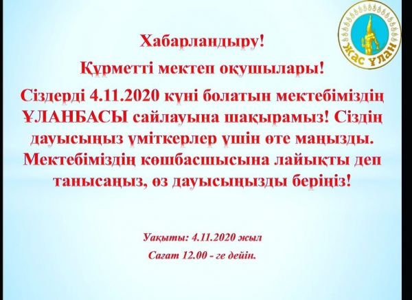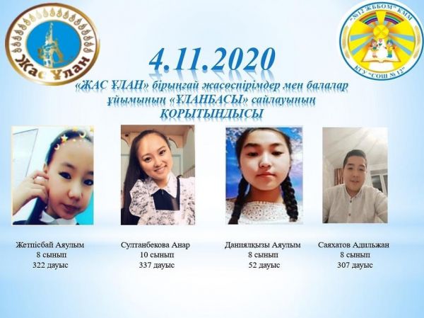 "Жас Ұлан" бірыңғай жасөспірімдер және балалар ұйымының "ҰЛАНБАСЫ" сайлауының қорытындысы шықты. Қорытынды бойынша ҰЛАНБАСЫ болып 10 "А" сынып оқушысы Султанбекова Анар…