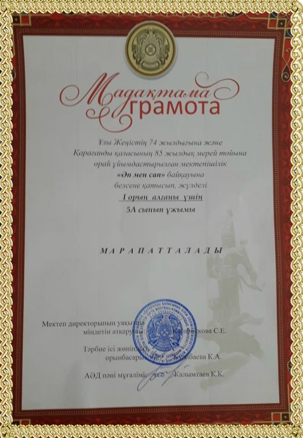 Ұлы Жеңістің 74 жылдығына және Қарағанды қаламыздың 85 жылдық мерейтойына орай өткен «Ән мен сап »байқауына қатысып 7А сыныбы 3 орынға ие болды .Топ басшысы Сламгалиев Б &laq…
