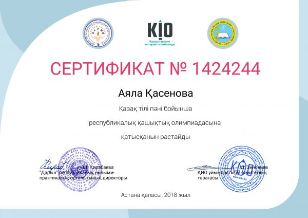 Қазақ тілі пәні бойынша Республикалық қашықтық олимпиадасының жеңімпаздары 9-сынып оқушысы Сағындықов Нұрасылды,6-сынып оқушылары Айтмағанбетова Аружанды,Қасенова Аяланы ,Жагслаг Аяул…