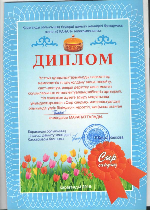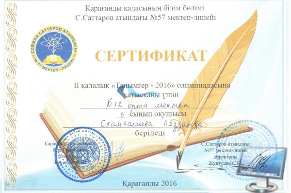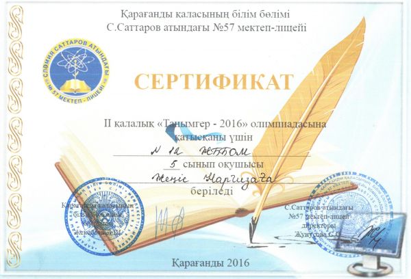 Оқушыларға арналған қалалық «Танымгер -2016 » олимпиадасына жаратылыстану пәнінен мектептің 5-6 сынып оқушылары қатысып, жүлделі І орын алғаны үшін 5 "Б" сынып оқушысы Мухаметк…
