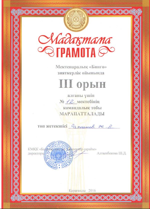 Балалар мен жеткіншектер сарайының ұйымдастыруымен өткен мектепаралық "Бинго" зияткерлік ойынында мектебіміздің командалық тобы III орынмен марапатталды.