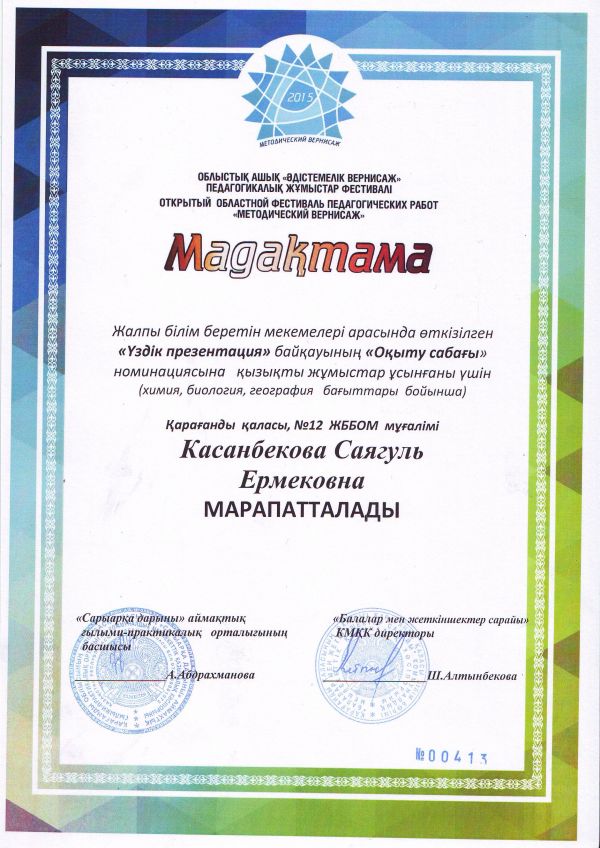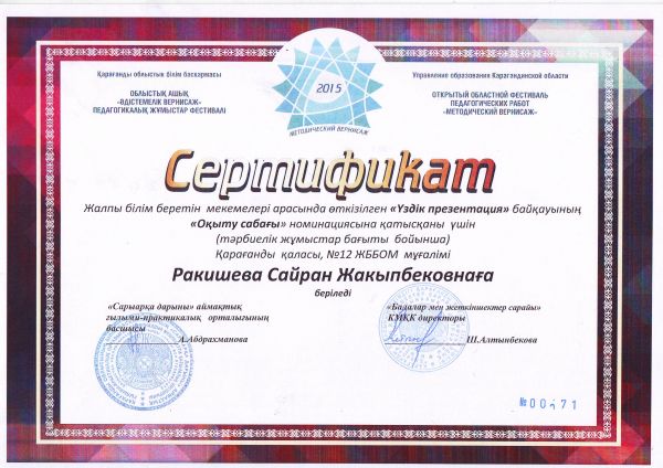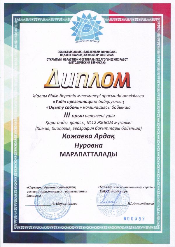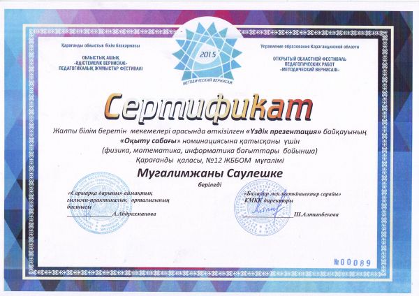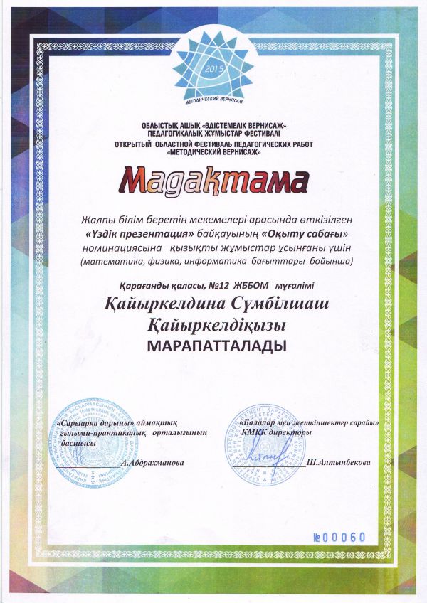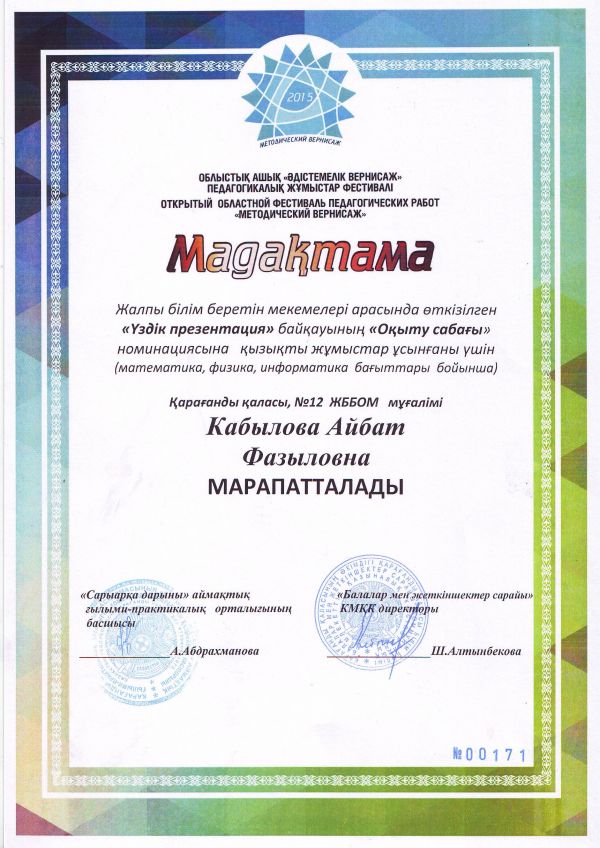 Қарағанды қаласының білім бөлімі өткізген «Көшбасшы-2015» физика-математикалық турниріне қатысып жоғарғы нәтиже көрсеткені үшін №12 ЖББОМ командасы Бас жүлдемен марапатталады.