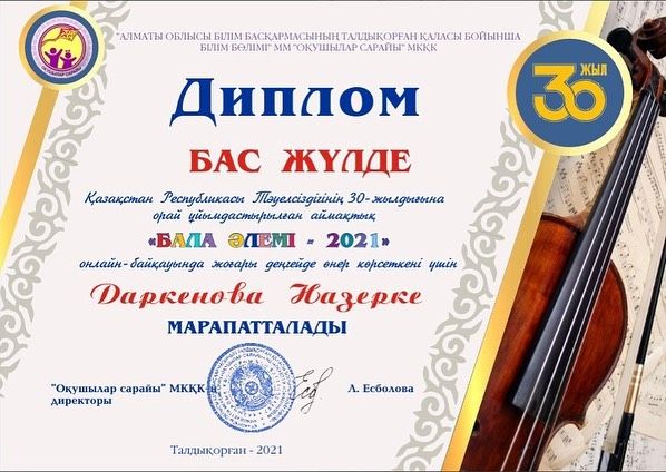 Ағымдағы жылдың 1-16 сәуір аралығында Талдықорған қаласы Оқушылар сарайы Қазақстан Республикасы Тәуелсіздігінің 30 жылдығына орай ұйымдастырған аймақтық "Бала әлемі" онлайн байқауы ө…