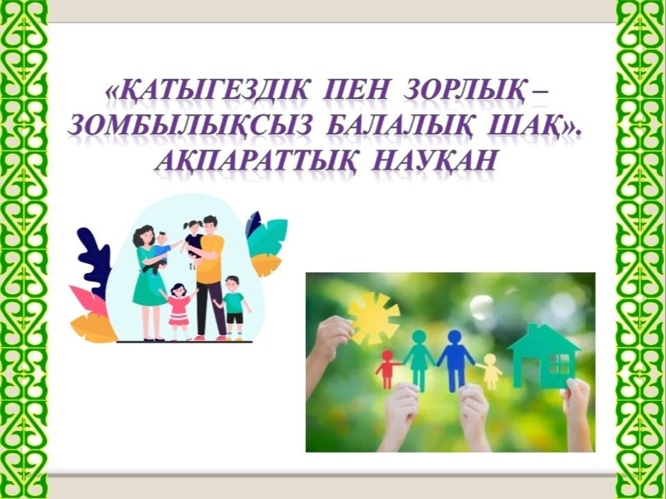 08-20 қараша аралығында "Қатыгездік пен зорлық - зомбылықсыз балалық шақ" ақпарат науқаны өткізіледі. Мақсаты: Балаларға қатыгездік пен немқұрайлылық мәселесіне қоғамдық назар аудару. Қоға…