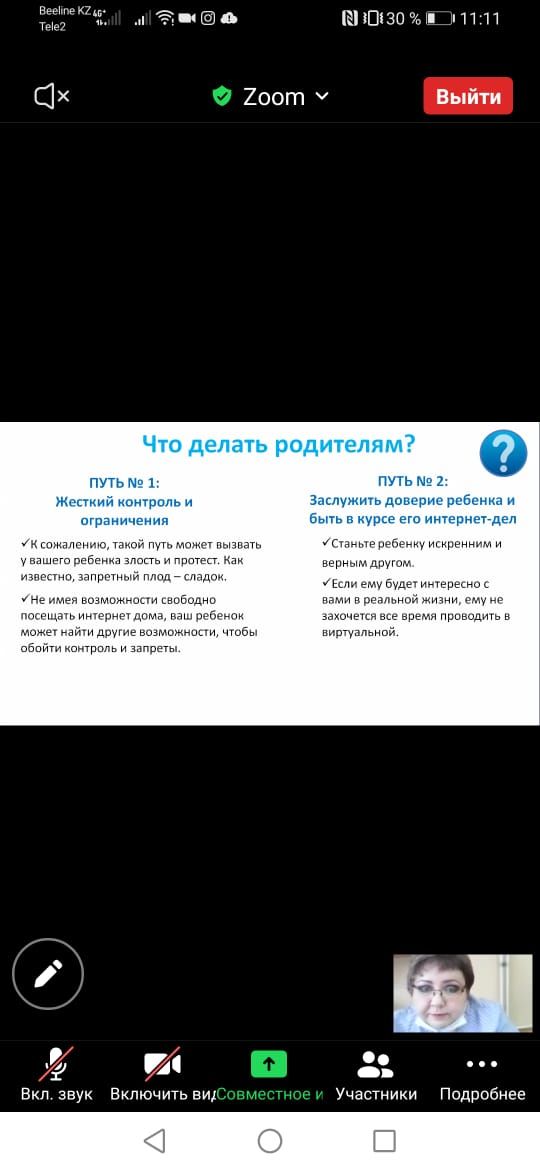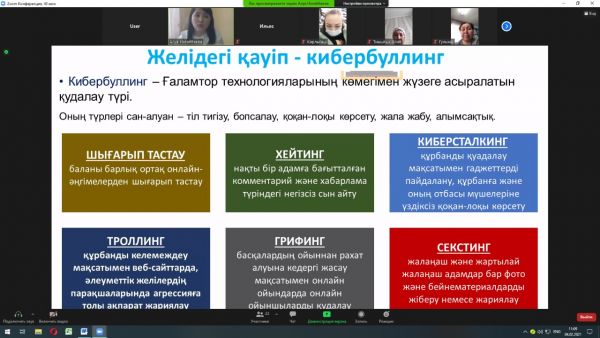 Педагогом- психологом школы № 85 г.Караганды была проведена онлайн встреча через платформу ZOOM c родителями 5-7 классов и педагогическим коллективом на тему: "Безопасное поведение детей в сети Интернет".