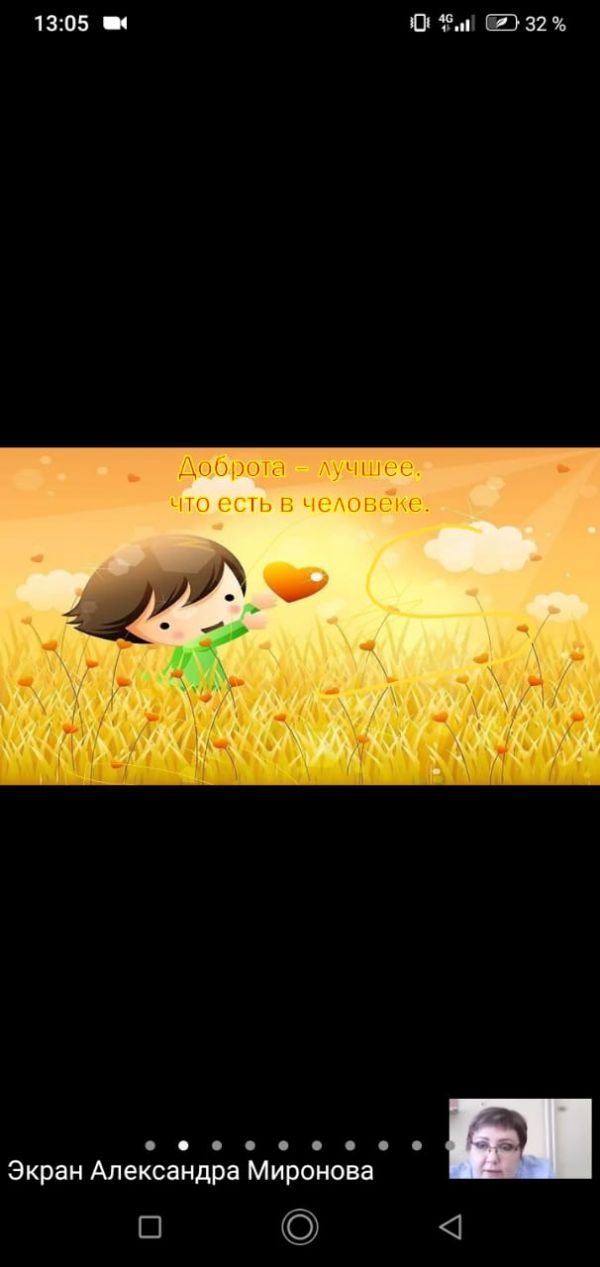 В КГУ СОШ № 85 в рамках декады по самопознанию учителем Мироновой А.Ю. была проведена онлайн встреча на платформе ZOOM с учениками 6-7 классов "Доброта- солнце, согревающее человека!"