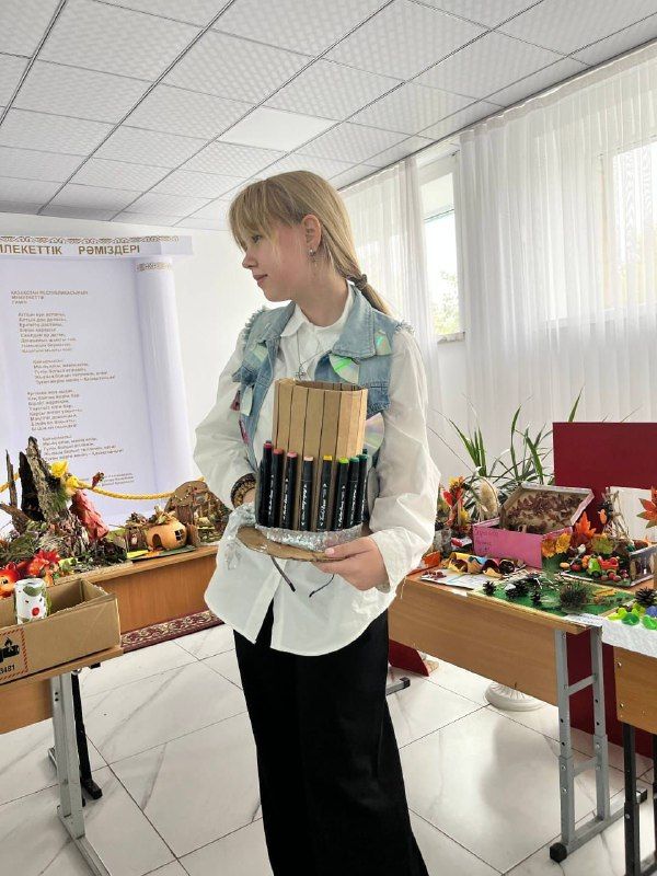 В рамках единой воспитательной программы "Адал азамат" ученица 7 "Б" класса Заремба Арина, представила свой Экологический костюм из бросового материла.