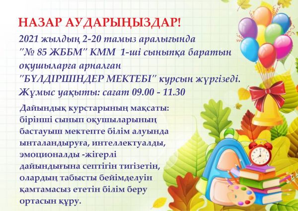 1-ші сыныпқа баратын оқушыларға арналған "БҮЛДІРШІНДЕР МЕКТЕБІ" курсын жүргізеді.
