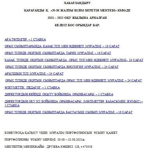 ҚАРАҒАНДЫ Қ. «№ 85ЖАЛПЫ БІЛІМ БЕРЕТІН МЕКТЕБІ» КММ-ДЕ
