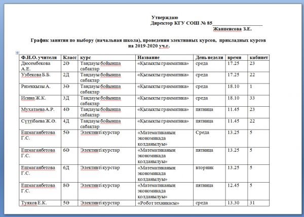 Дамушы сипаттағы жеке және топтық сабақ кестесі, жеке және топтық жұмыс сабақтары, элективті курстар