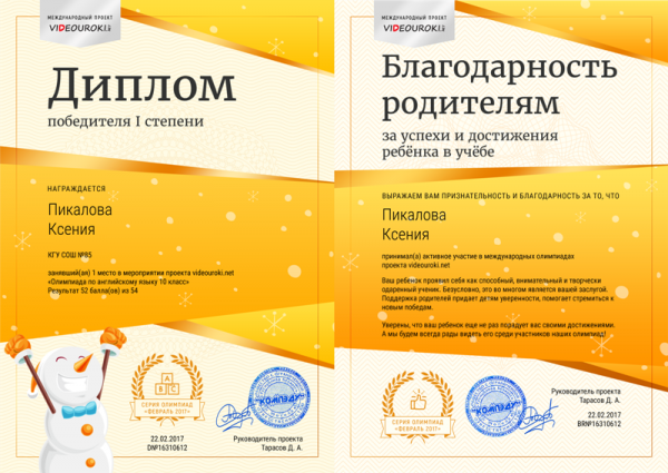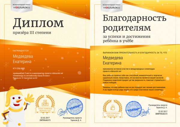 Поздравляем победителей в мероприятии проекта videouroki.net«Олимпиада по английскому языку»!