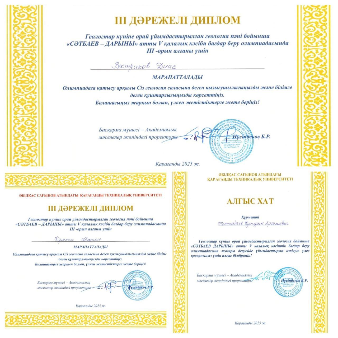 3.04.2025г. на базе КарТУ им академика А.Сагинова прошла профориентационная олимпиада по геологии"Сәтбаев дарыны-2025" среди учащихся 10-11 классов, где приняли участие Кумпан Максим и Вос…