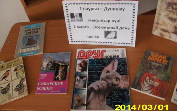 Мектеп кітапханасының қызметкерлері  Е.М.Паршкова мен З.Р.Жусупова 2Б сыныпта «Барлығы мысықтар туралы» атты Дүниежүзілік мысықтар күніне арналған мереке өткізді.    &nb…
