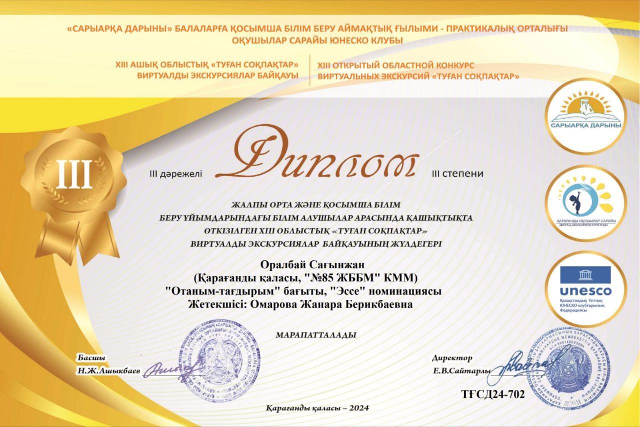 4 "Ә" сынып оқушысы Батырханқызы Бексана бүгін Сарань қаласында өткен "КҮЙ-ТӘҢІРДІҢ КҮБІРІ"атты облыстық домбырашылар фестиваль-байқауына қатысып 3 орынды иеленді, ҚҰТТЫҚТАЙМЫЗ!!…