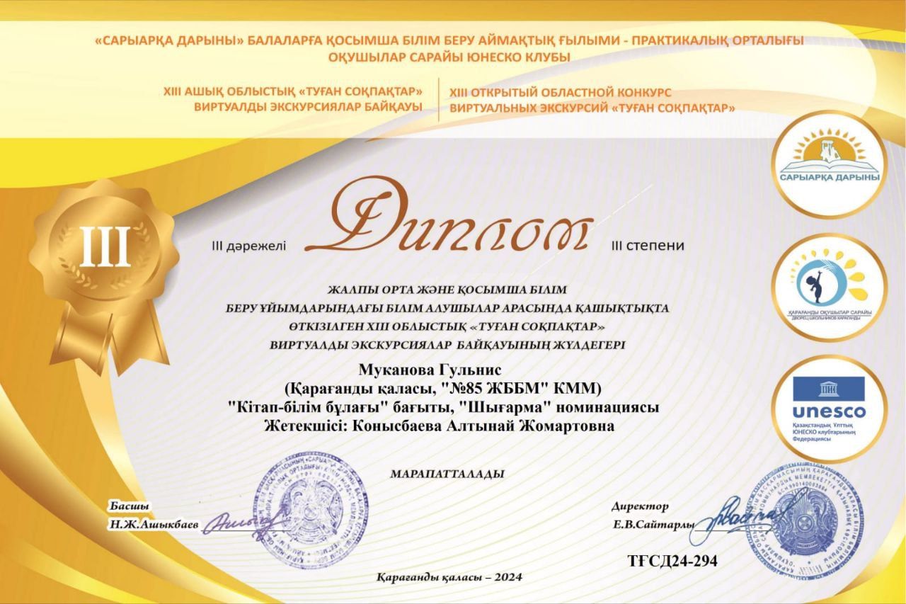 ХІІІ облыстық "Туған соқпақтар" виртуалды экскурсиялар байқауының жүлдегерін құттықтаймыз!!!